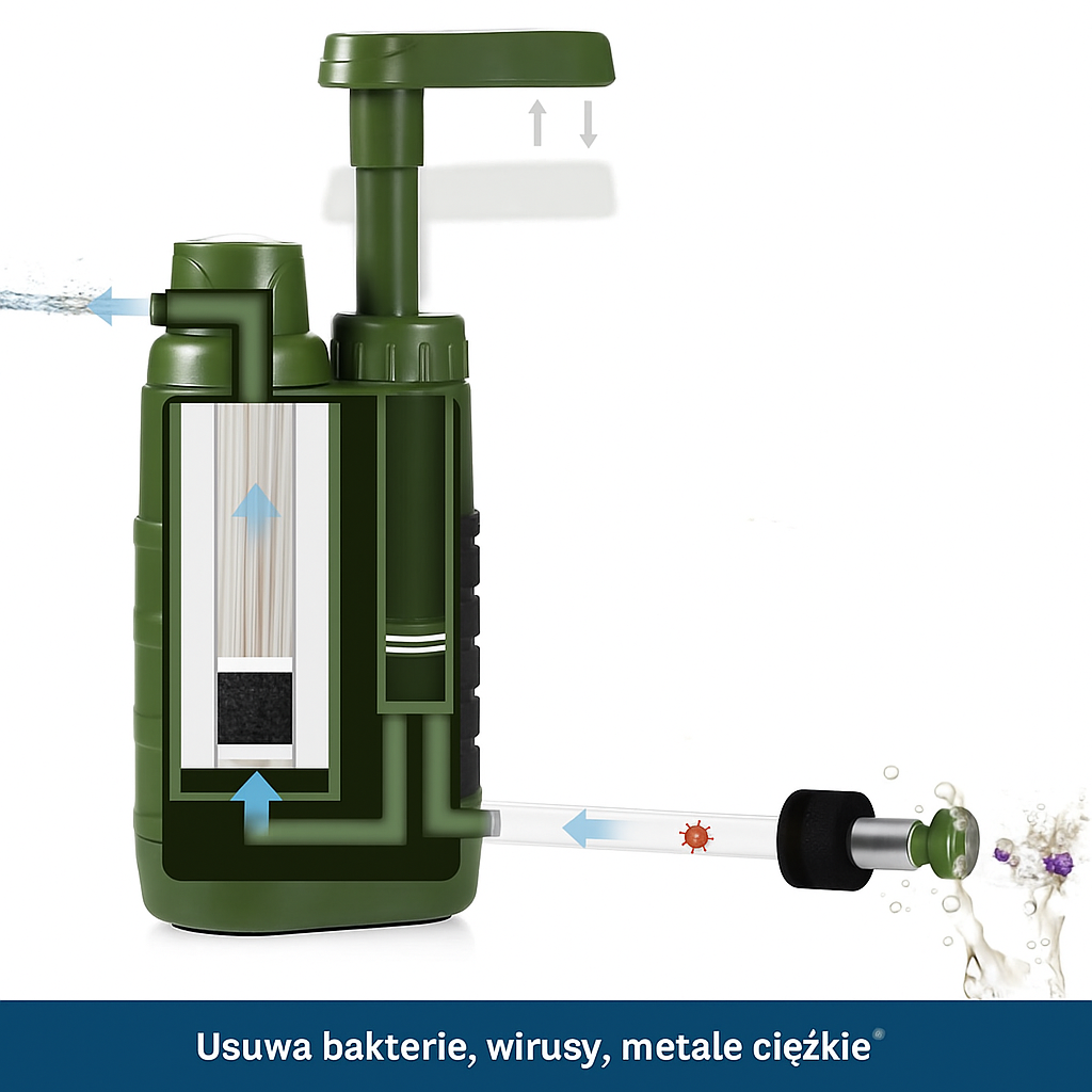 Pompa filtrująca wodę z węglem aktywnym i membraną UF – filtr survivalowy do outdooru i podróży